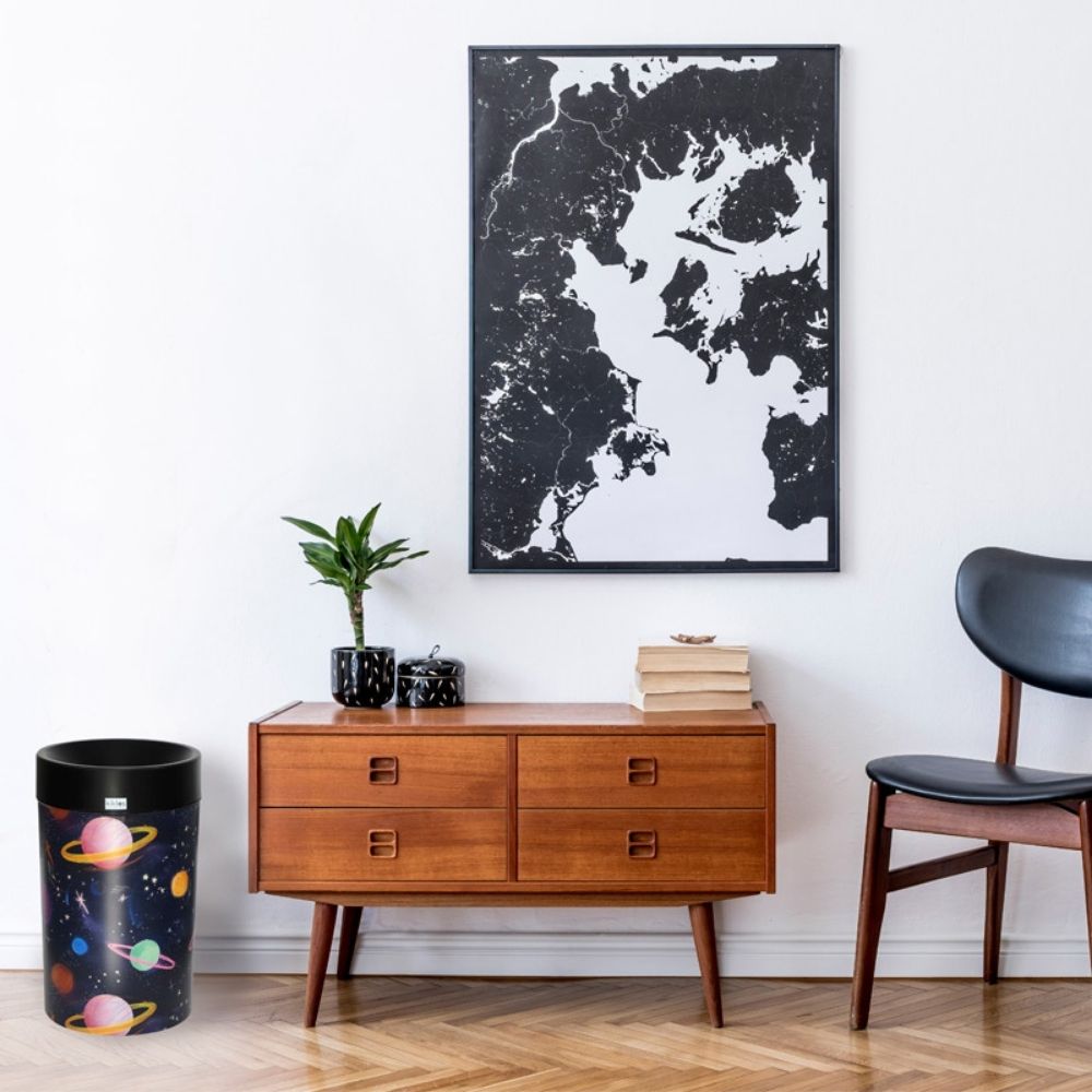 Plastic garbage bin IML 28lt planet print and open top, ideal for bedrooms and office spaces.