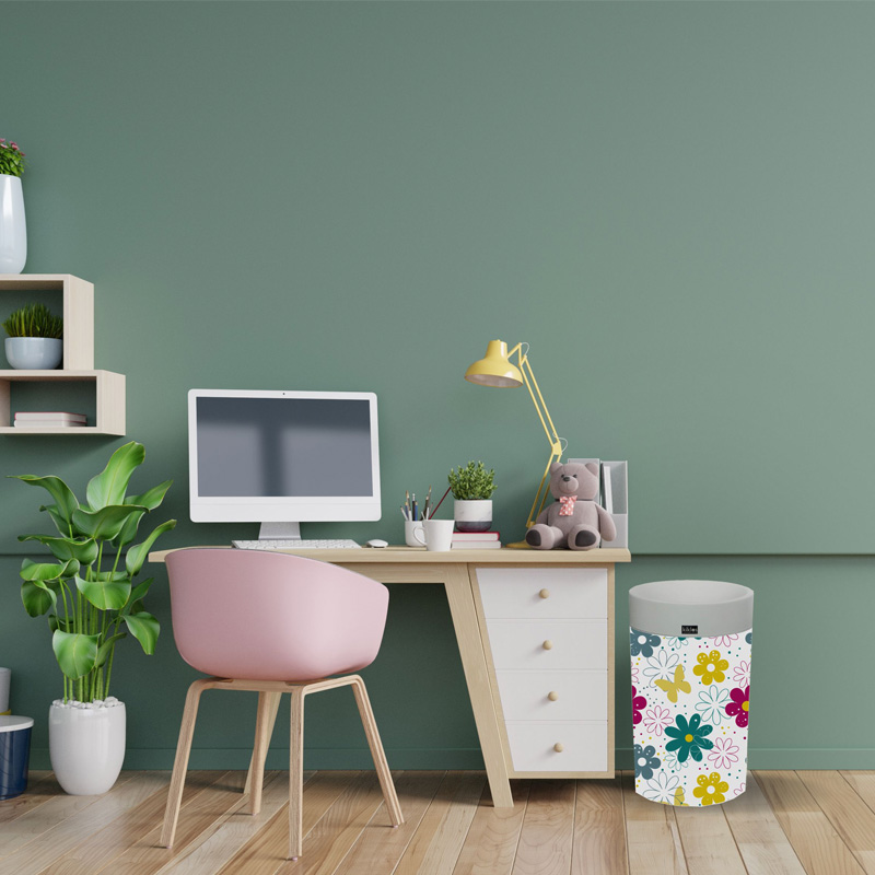 Plastic garbage bin IML 28lt daisy print and open top, ideal for bedrooms and office spaces.